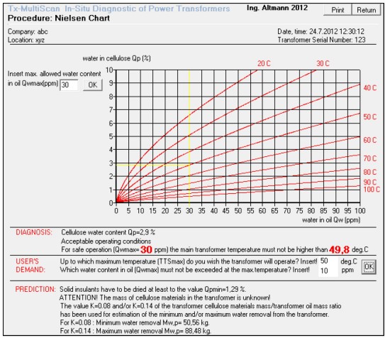 The Tx-Multiscan not only show us the TLC-relation of a given transformer but enables us, by entering of demanded dielectric strenght and demanded Tx-temperature, to quantify the amount of water which has to be removed to meet this target.